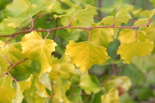 Листья: треугольные, заостренные, золотисто-желтые, матовые.