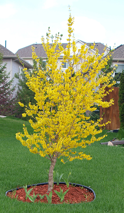 Широкораспростёртый декоративный кустарник высотой и шириной 200-250 см. Листья длиной 5-7 см, тёмно-зелёные, зазубренные по краю. Цветки золотисто-жёлтые, очень крупные, длиной до 4 см, колокольчатые со сросшимися у основания широкими лепестками, слегка душистые. Цветение в апреле в течение 2-3 недель, до распускания листьев, очень обильное, по всей длине побегов. Место солнечное. Почва умеренно влажная, лёгкая. Зона 5 (до -23ºС). В суровые зимы наблюдается подмерзание цветковых почек. Подходит для живых изгородей. Очень хорошо переносит обрезку