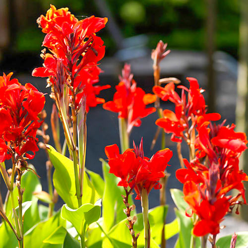 Канна зеленолистная Бриллиант (Canna Brilliant) непременно понадобится для облагораживания своего сада. Оригинальное крупное растение с большой миндалевидной листвой до 1 метра в высоту и огненными 15 сантиметровыми алыми соцветиями, преобразит место отдыха в тропический рай. Канна гибридная прекрасно смотрится у водоемов, прудов, вдоль дорожек и заборов, в ландшафтном дизайне на клумбах. Это южное растение обожает свет, солнце и регулярный полив, цветет непрерывно все лето и осень, при этом цветки в соцветиях раскрываются один за другим. На зиму цветок выкапывают с земляным комом, и убирают на хранение в подвал.