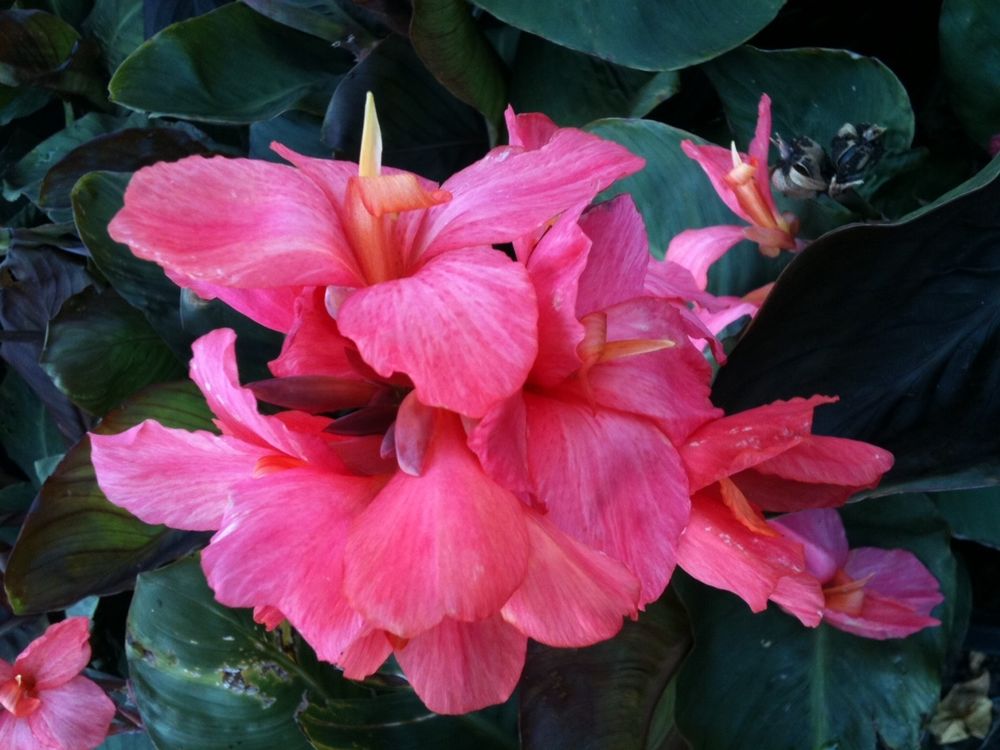 Канна Эрик Ньюберт - оранжево-красные цветки собраны в рыхлое кистевидное соцветие. Листва темно-зеленая, со временем становится бронзово-красной с фиолетовым оттенком. Сорт хорошо развивается на солнечных, защищенных от холодного ветра местах. Очень красива канна при посадке в большие группы и одиночных посадок, а также для озеленения в качестве горшечных растений. Хороша также канна Эрик Ньюберт летом на балконах и террасах.