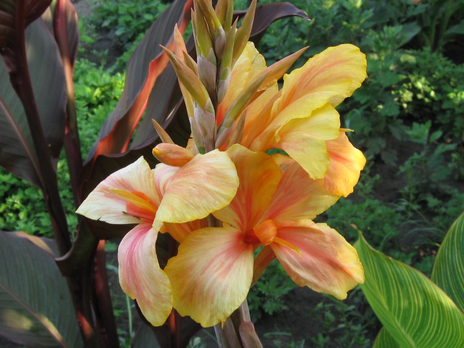 Канна зеленолистная Фиеста - травянистое растение с клубневидными корнями, прямым, вертикальным, лишенным ветвления стеблем высотой 70-150 см, листьями зеленого оттенка. Цветки без запаха. Цветок золотисто-желтого окраса с кораллово-розовыми штрихами и более насыщенной сердцевиной. Цветок крупный, ассиметричный, с короткими цветоножками.