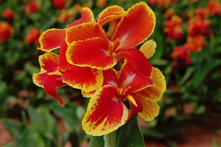 Канна зеленолистная Роземунд Коль (Rosemond Coles) рекомендуют к покупке дизайнеры для создания яркого акцента в саду. Растение этого сорта – крупномер, достигает 90 сантиметров в высоту. Цветки очень крупные, насыщенного красно-оранжевого цвета. Каждый лепесток имеет чёткий жёлтый кант по краю, который только подчеркивает яркость основного тона. Наиболее выигрышно канна Роземунд Коль смотрится, высаженная на газоне группой по несколько растений. Огненные цветки, обрамленные крупной зеленой листвой, полыхают огнём и надолго притягивают взгляд.