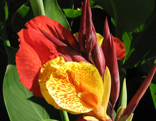 Цветки могут быть красными, жёлтыми или красно-жёлтыми с едва различимыми пятнышками. Цветение в июле-сентябре. Листья большие, широкие, бананоподобные, могут быть зелёными, бронзовыми или смесью двух цветов. Высота 90-120 см. Фантастически выглядит в большом цветочном горшке. На зиму следует выкапывать с комом земли и хранить в сухом прохладном помещении. Место солнечное, защищённое от ветра. Почва рыхлая, влажная, богатая органикой. Зона 7 (до -15ºС).
