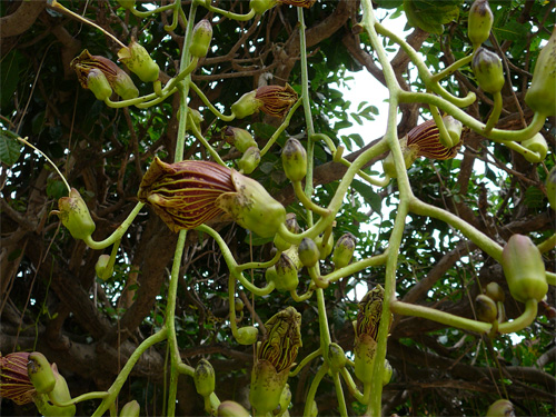 Kigelia pinnata — дерево с густой кроной, опадающей на время засухи. Цветёт крупными красными цветами. Плоды похожие на колбасы, длиной до 60 см, в диаметре до 10 см и весящие до 5 кг, свешивающиеся с ветвей. Они могут висеть на дереве месяцами, медленно увеличиваясь в размере и вызревая до нужной кондиции.