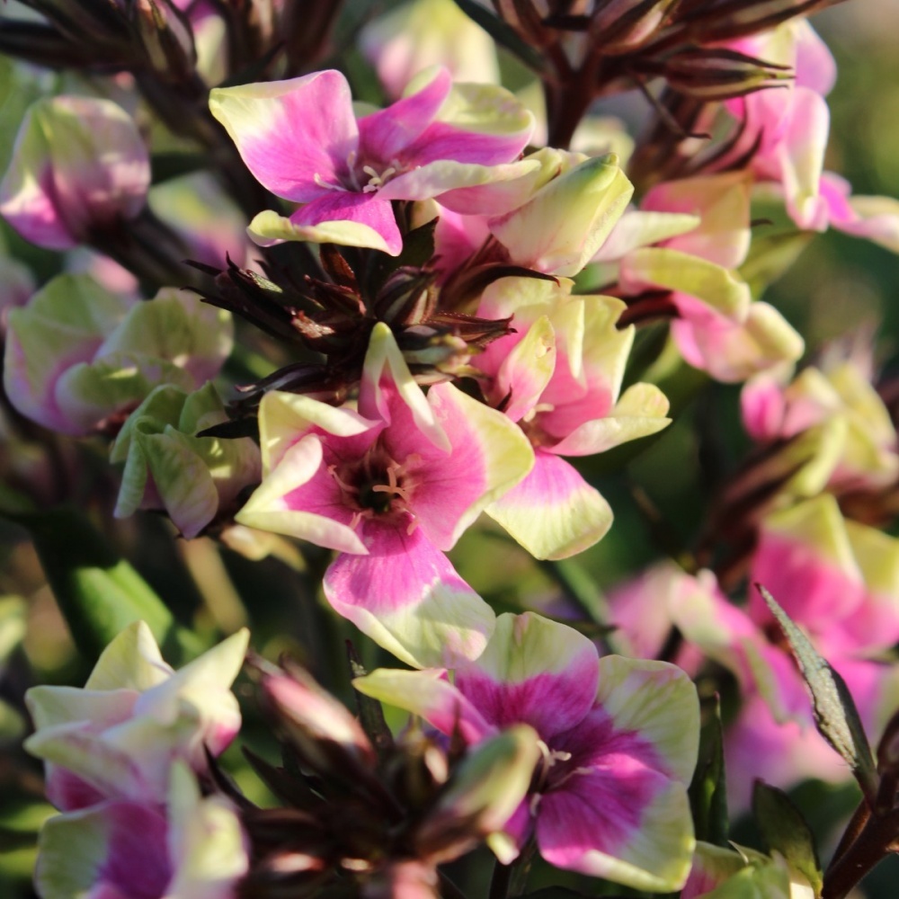 Флокс метельчатый Майкс Чойс - сорт с необычной окраской! Цветки малиновые с широким желто-зеленым волнистым краем, некрупные, диаметром 1,5-2 см. Бутоны кремовые, с темно-бордовыми прицветниками. Куст прочный, компактный, высотой до 55 см. Для посадки выбирают слегка притенённые места, с влажной почвой, богатой питательными веществами и удобренной навозом. Флоксу метельчатому Майкс Чойс необходимы подкормки, рыхления и обильный полив (почва должна быть всегда влажной, но не переувлажнённой).
