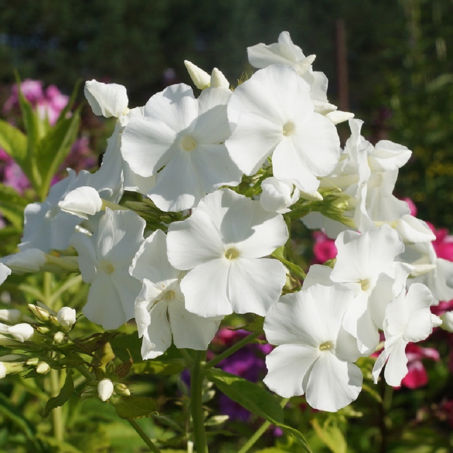 Флокс метельчатый Панама - куст высотой до 70 см. Куст сильный, многостебельный, раскидистый, быстро разрастается. Соцветие округло-коническое, среднего размера и плотности. Цветок белый, чистого тона, диаметром 3,5 см. Венчик колесовидный со слегка волнистыми лепестками. Флоксу метельчатому Панама необходимы подкормки, рыхления и обильный полив (почва должна быть всегда влажной, но не переувлажнённой).