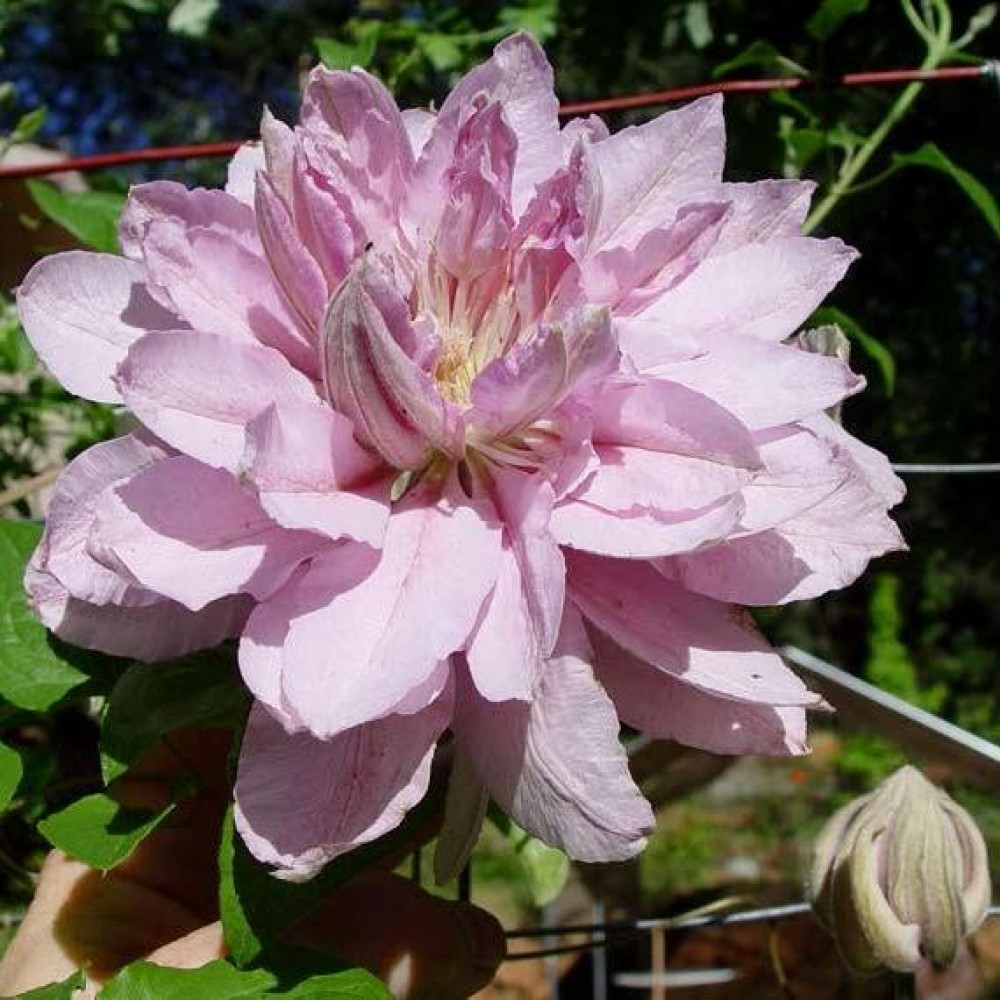 Клематис крупноцветковый Виолет Элизабет - с повторным цветением за период, первое цветение с мая по июнь (цветет полумахровыми цветками на побегах прошлого года), второе цветение с августа (цветет простыми цветками на побегах текущего года). Цветение очень обильное и продолжительное. Растение вьющееся, высота клематиса от 1,5 до 2,5 метров. Цветки крупного размера, жемчужно-розового цвета. На зиму Клематис крупноцветковый Виолет Элизабет требует слабой обрезки (достаточно легкой стрижки). Высадку производят в южной, западной или восточной части участка.
