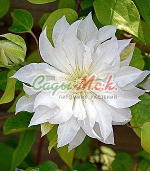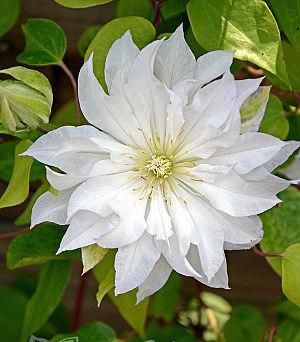 Цветки крупные, диаметром 10–15 cм, с 20–30 слегка волнистыми белыми чашелистиками и стаминодиями, жёлтые пыльники на белых нитках и светло-жёлтые столбики. Цветёт от половины VI–половины VIII как на побегах текущего года, так и на прошлогодних. Цветки появляются на высоте около 1 м. от основания. Листья светло-зелёные, края ровные, простые, сердцевидные, тройчатые, листочки овальные, заострённые.