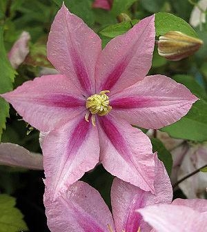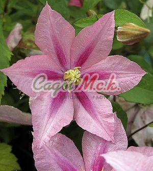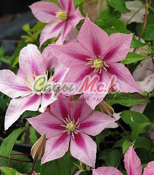 Цветки среднего размера, диаметром 8–12 см, с 6 розово-лососевого цвета чашелистиками и с тёмно-розовой полоской посередине бледнеющей к верху. Цветки, благодаря тычинкам с жёлтыми пыльниками на бело-розовых нитках и жёлтым столбикам выглядят светлее. Цветёт VI–VIII. Листья простые или тройчатые, тёмно зелёные.
