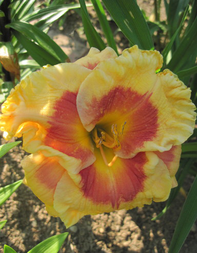 Лилейник X Factor– красивое травянистое многолетнее растение с крупными цветами, достигающими в диаметре 18 см. Сорт отличается удивительно гармонической цветовой гаммой – на желтом фоне большой ярко-красный глаз в обрамлении роскошной гофрированной каймы. Широкое зеленое горло усиливает необычную красоту этого удивительного цветка. Растение обильно и раннецветущее. Уже в июне–июле на взрослом трехлетнем растении могут распуститься до 200 бутонов. При благоприятной погоде в конце лета цветение обычно повторяется. Лилейник отнимает минимум времени. Он неприхотлив в уходе, спокойно воспринимает любые климатические условия, может много лет расти на одном месте.