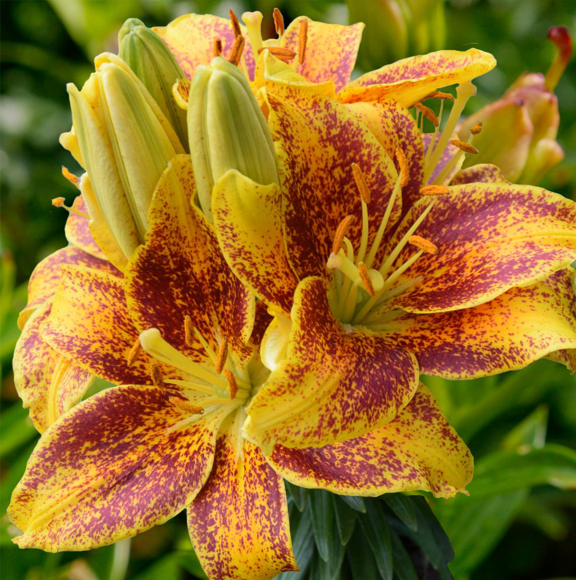 - Характеристики ярко-желтый с густым темно-красно-оранжевым крапом по всему лепестку, на кончиках крап реже и мельче, диаметр цветка 13-15 см