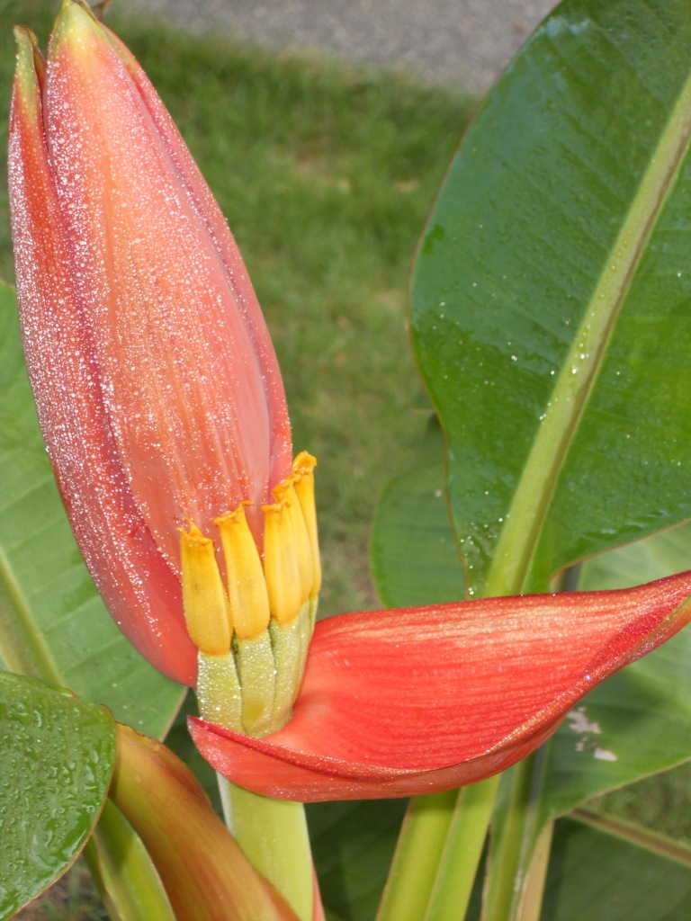 Musa ornata Orange Flower - низкорослый плодовый цветущий банан высотой до 3-х метров. Листья декоративные, крупные, зеленого окраса с фиолетовым жилкованием. Цветки желтые, прицветники красно-оранжевые, огромные. Плоды темно-розового или кремового окраса.