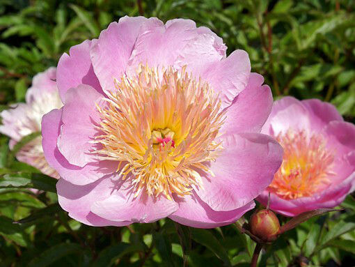 Травянистый пион Doreen японской формы с лёгким сладким ароматом. Лепестки округлые двухрядные, изумительного амарантового цвета. Стаминодии очень крупные затейливо завиваются, розовые у основания они выше к краю становятся сливочно-золотыми. В диаметре цветок достигает 18 см, при роспуске от его великолепия сложно отвести взгляд. Компактный и устойчивый куст достигает в высоту 80 см, густо усыпан глянцевой листвой. Цветение обильное и пышное с начала июня.