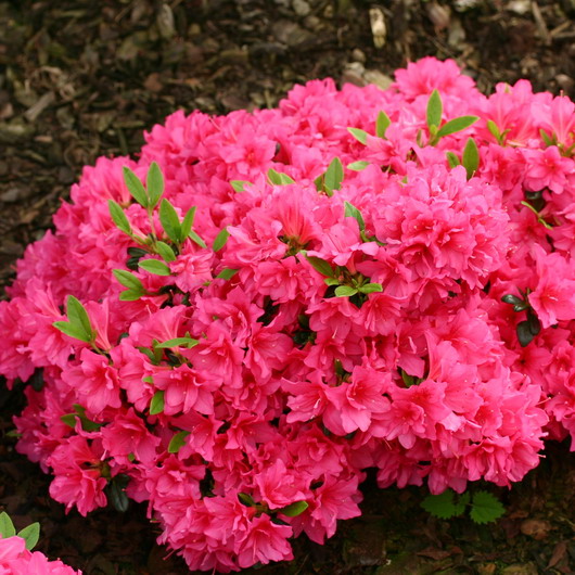 Рододендрон Kermesina - плотный густорастущий кустарник, высотой 0,6-0,8м и до метра в диаметре. Цветки мелкие, многочисленные, рубиново-розовые с красным оттенком. Цветёт с середины мая до начала июня. Листья темно-зеленые, зимующие.