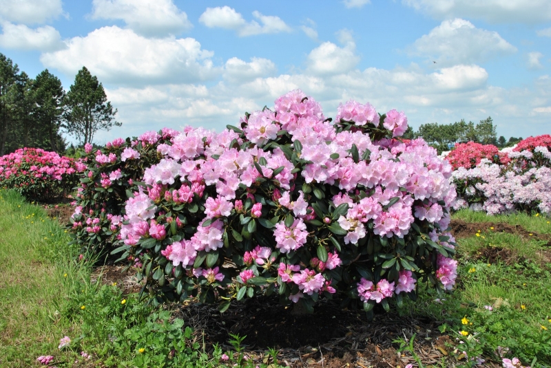 Саженцы рододендрона Сильберволке имеют розовые бутоны и белые цветки, что смотрится довольно нежно.