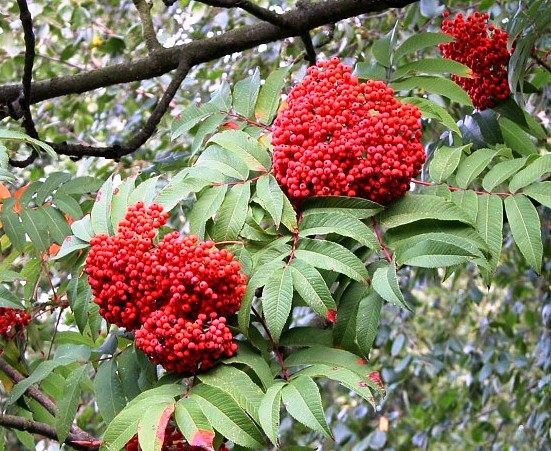 Кора имеет темно -серый цвет , а побеги очень толстые, с крупными ( 1-2 см), темно – красными, липкими смолистыми зимними почками . Листья самые крупные у любой рябины, темно -зеленые с рельефными прожилками сверху, сизые снизу, 20-35 см длиной и 15-20 см шириной. В середине осени они изменяются от насыщенного оранжево-розового до фиолетового или темно -красного цвета .