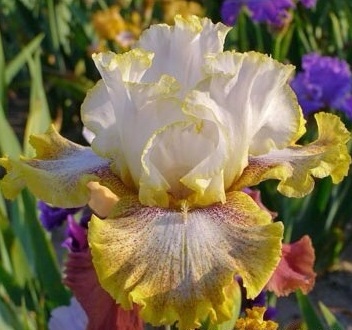 Рассада ириса Ring Around Rosie обладают редким уникальным сочетанием цветов. Нижние доли (фолы) – это пестрая смесь из белого, фиолетово-сливового и оранжевого цветов, которые плавно проникают друг в друга, благодаря россыпи разноцветных точек. Оранжевая кайма красиво гофрирована. Верхние доли (стандарты) окрашены в чистый белый, молочный цвет и украшены тонкой лимонной гофрированной каймой. Бородки - ярко-желтые, их оттенок полностью совпадает с окраской оборки на фолах. Расцветка уникальна и не имеет аналогов в других сортах.