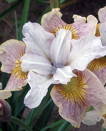 Ирис сибирский Лемон Вейл позволит облагородить любой участок во время цветения. Его цветы имеют классический оттенок, который можно сравнить с благородными розами или лилиями. Верхние волнистые лепестки кремово-белого оттенка с желтыми прожилками конкурируют по красоте с нижними нежно-лавандовыми с более темными прожилками. Все это великолепие при солнечном освещении создает ощущение переливающихся оттенков. Сами цветки имеют очень эффектную форму, мимо них просто не удастся пройти.