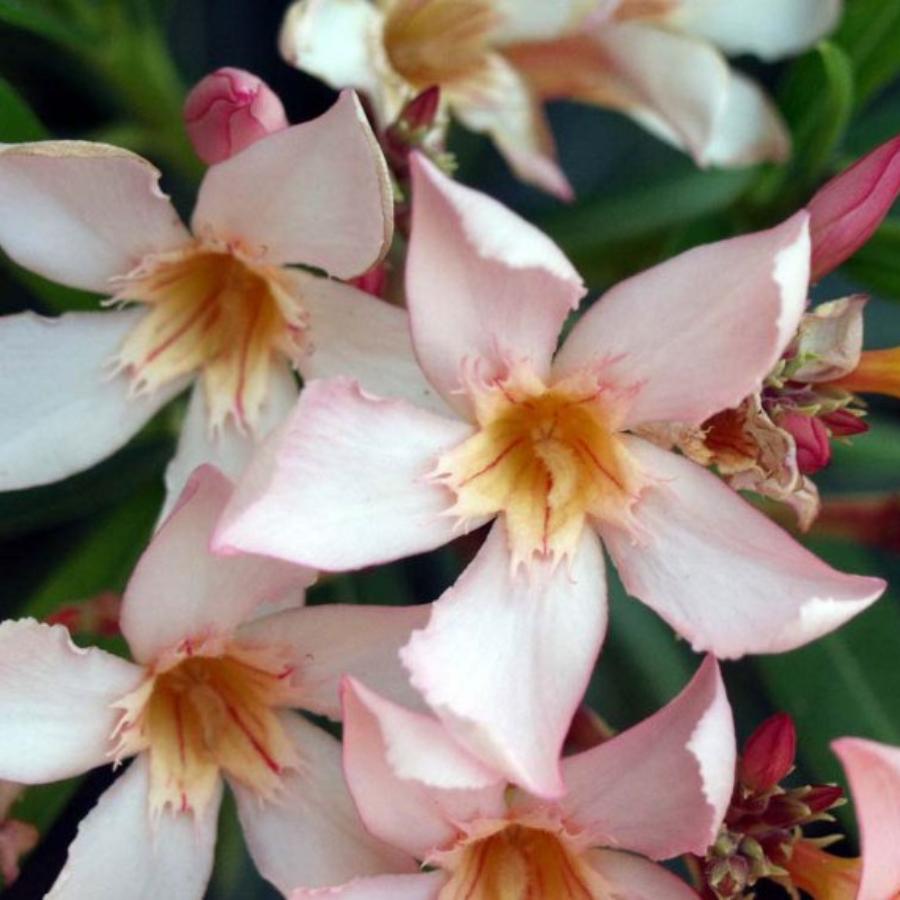 Олеандр обыкновенный Касабланка (лат. Nerium oleander Casablanca) - компактный цветущий кустарник. Летом радует обильным цветением белых с розовым оттенком и желто-оранжевым основанием простых цветков, обладающих нежным ароматом. Сорт вынослив и неприхотлив. Внимание! Олеандр - ядовитое растение, поэтому при его культивировании требуется осторожность.