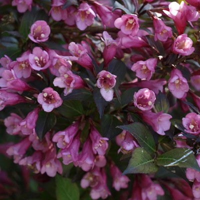 Вейгела Фоллис Пурпуреус - Кустарник от 1 до 1,5 м высотой с густой кроной диаметром около 2 м. Листья эллиптические, коричнево-красные, красно-зеленые, длиной 6 - 8 см, осенью долго остаются на ветвях .Цветки длиной 2,5 - 3 см, темно-розовые с желтой серединкой, собраны в соцветия по 3 - 4 штуки, контрастируют с листьями Цветет в июне-июле.
