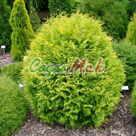 Декоративные качества: Декоративна благодаря шаровидной естественной форме кроны и золотисто-зеленой хвои.